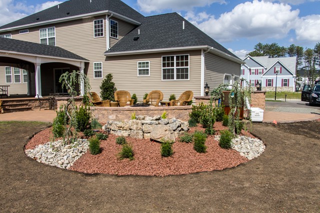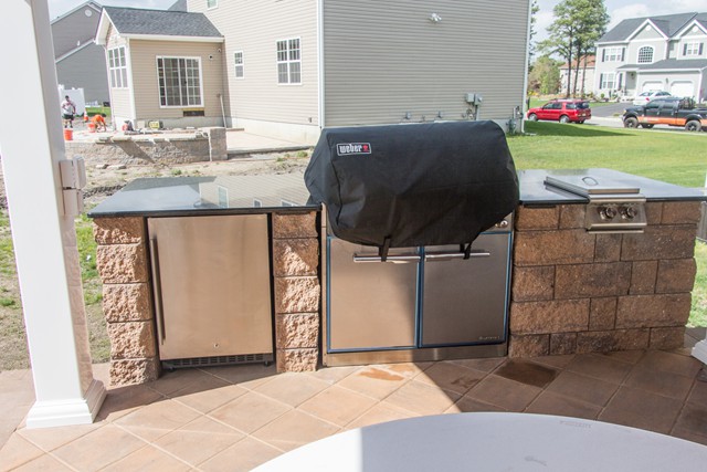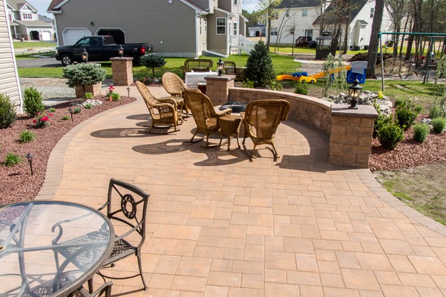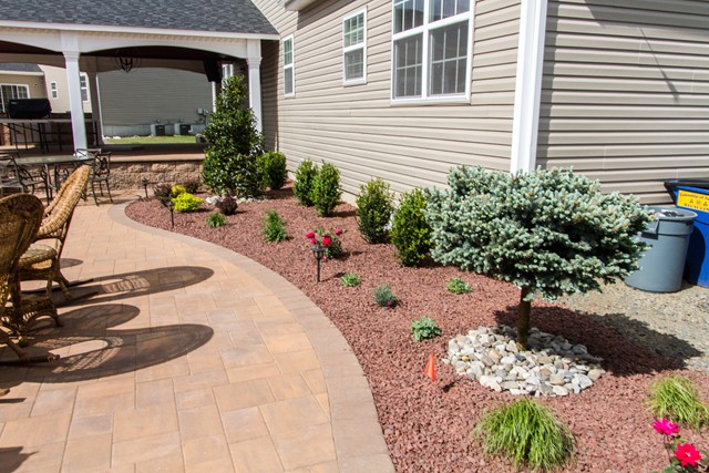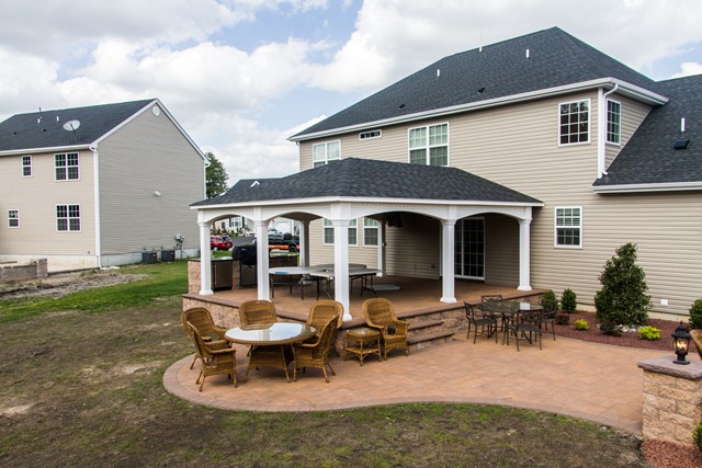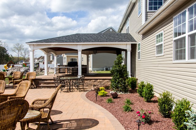 Just Landscapes recently installed a raised patio, as part of a backyard hardscaping & landscaping project, and included a pavillion roof over the patio.